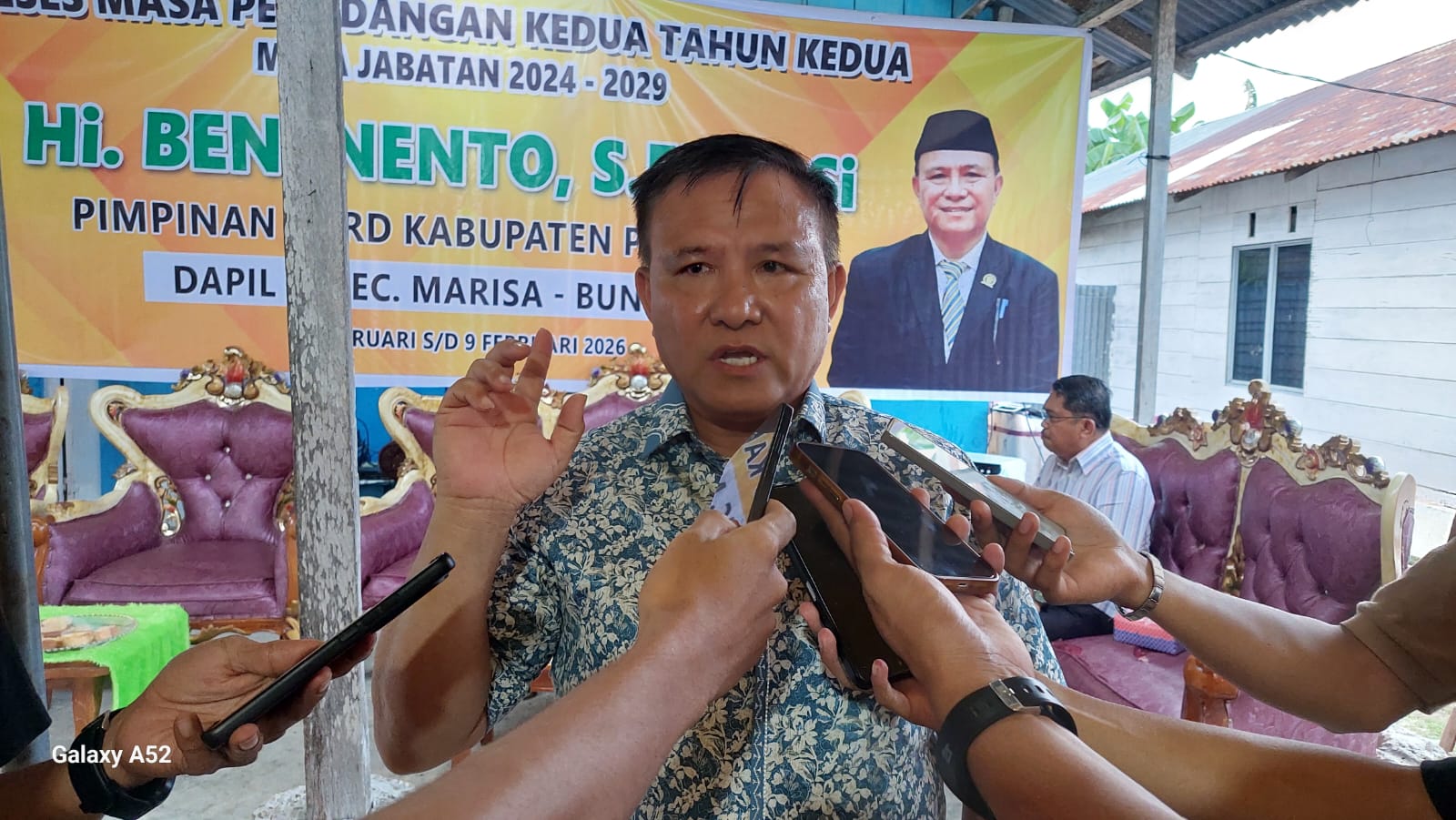 POHUWATO (Brainline.id) – Ketua DPRD Kabupaten Pohuwato dari Daerah Pemilihan (Dapil) 1 Marisa–Buntulia, Beni Nento, melaksanakan kegiatan reses masa persidangan kedua tahun kedua masa jabatan 2024–2029 di Desa Pohuwato, Kecamatan Marisa, Minggu (8/2/2026).